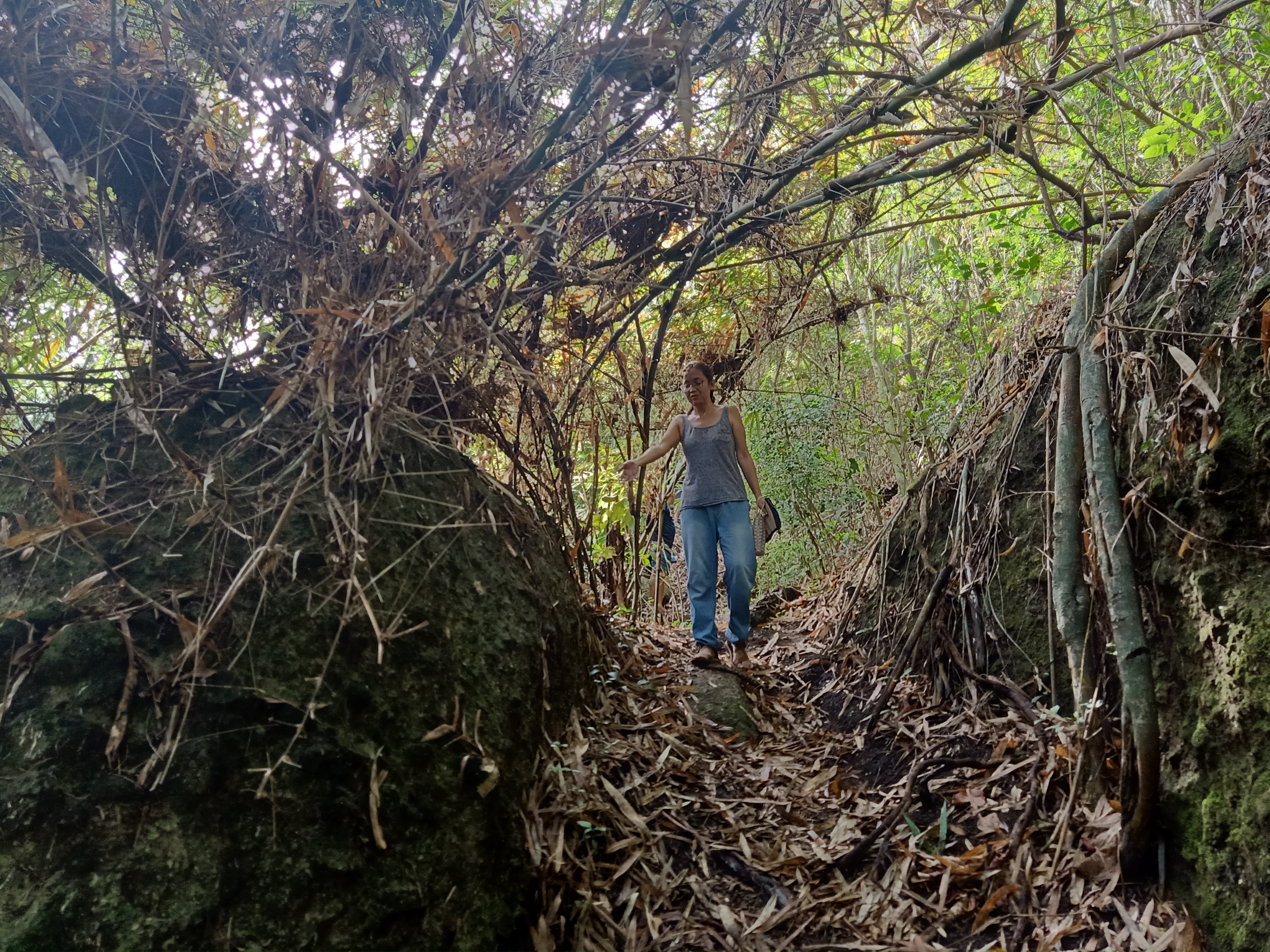 The small mountains of Maragondon can be seen from this point. Our guide, who is also the shrine caretaker, pointed the different mountains there, the names of which I couldn’t remember. We continued walking on the grass field until we entered a bamboo forest. As we kept walking along the trail, the scenery transitions from fields to bamboo forests.