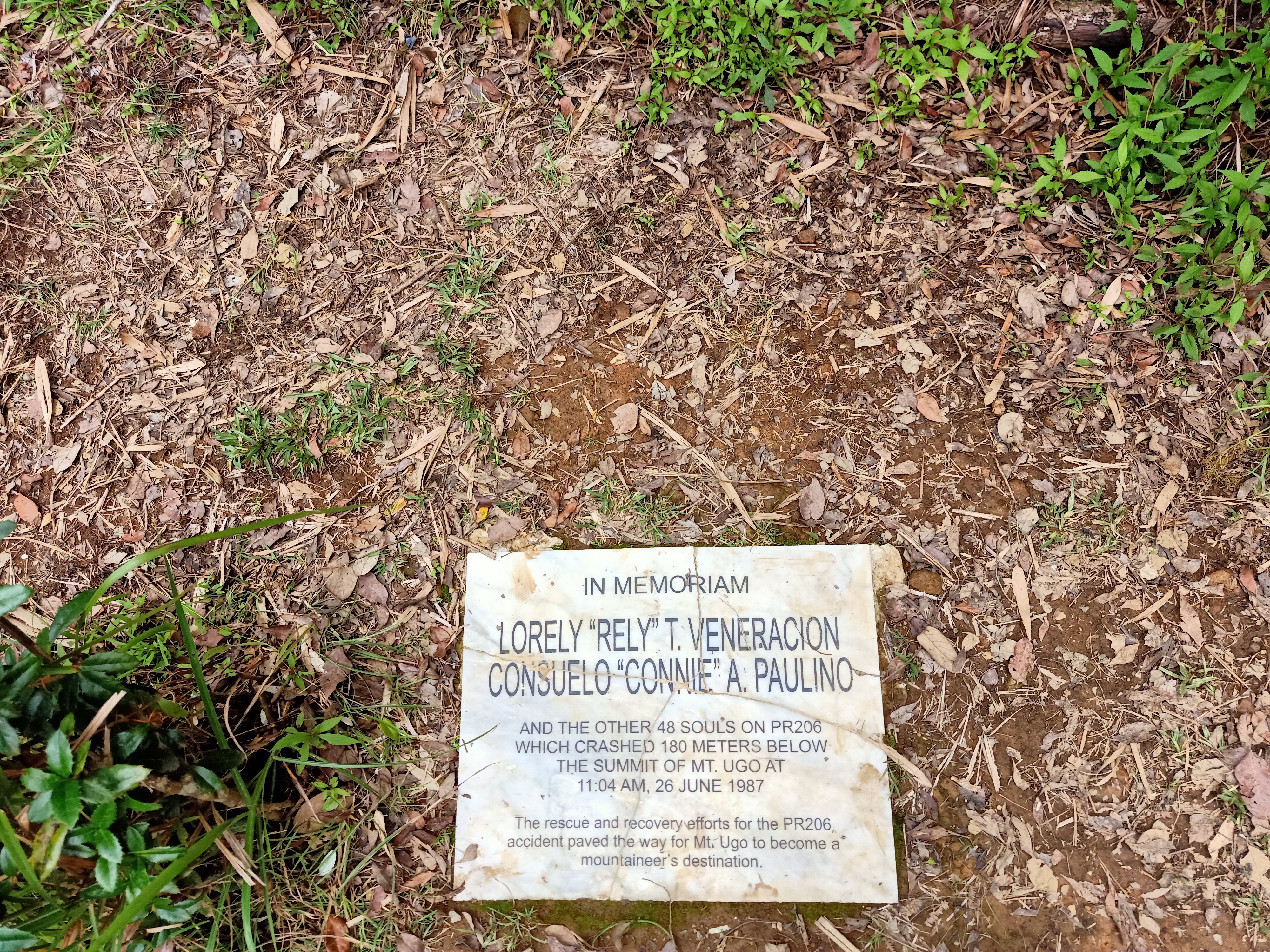 I thanked the heavens when we finally reached the summit at exactly twelve noon. There, the four fastest hikers were already waiting for us. Then, we were followed by Sir Kent whom I joined with during our Mt. Purgatory hike and Doc Israel. The eight of us had our sumptuous lunch at the summit and slept afterwards. I also took some pictures beside the summit signboard. A gravestone is also erected in the summit area, commemorating the 50 people who died along the slopes of Mt. Ugo after their plane crashed. This happened in 1986 and paved the way for mountaineers to explore Mt. Ugo.