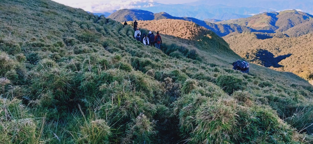 After thirty minutes of rest, we continued the hike. The trail after Camp 2 was the start of the grassland area, where the surroundings were filled with bamboo grass. There, the trail was mildly ascending, with the slopes of the grassland hills surrounding us. Moving fogs were also by our side and everywhere. At first, you would think that the famed sea of clouds would be scant because of this atmospheric condition. However, I knew that the fog would later on subside and reveal the spectacular view.