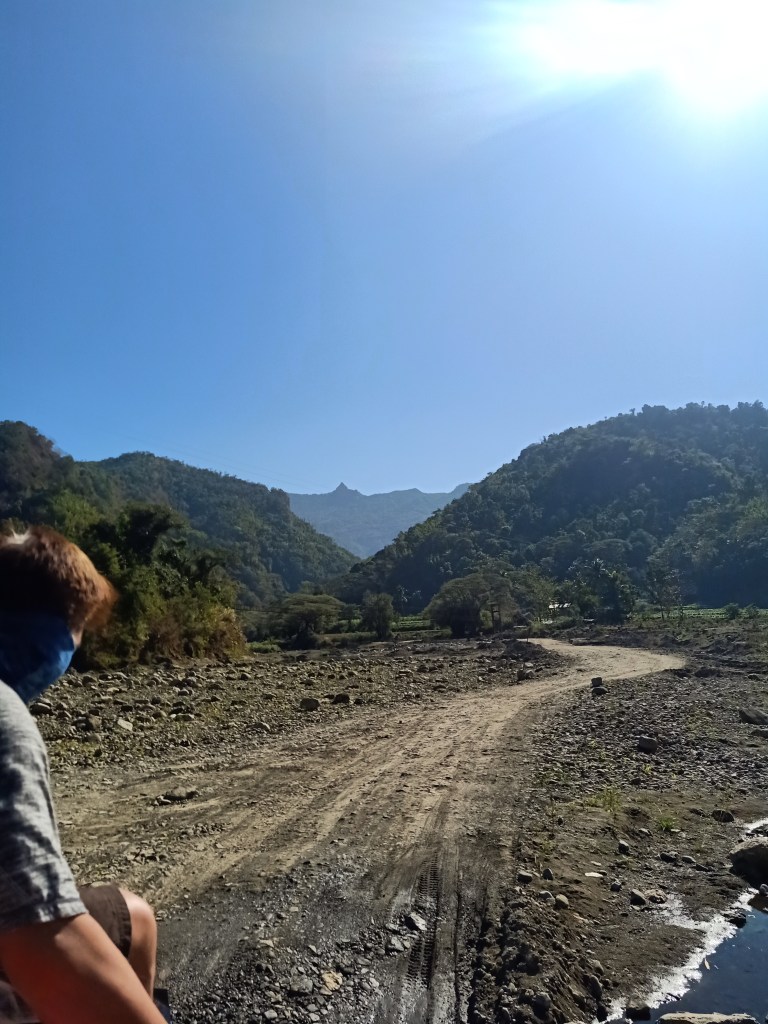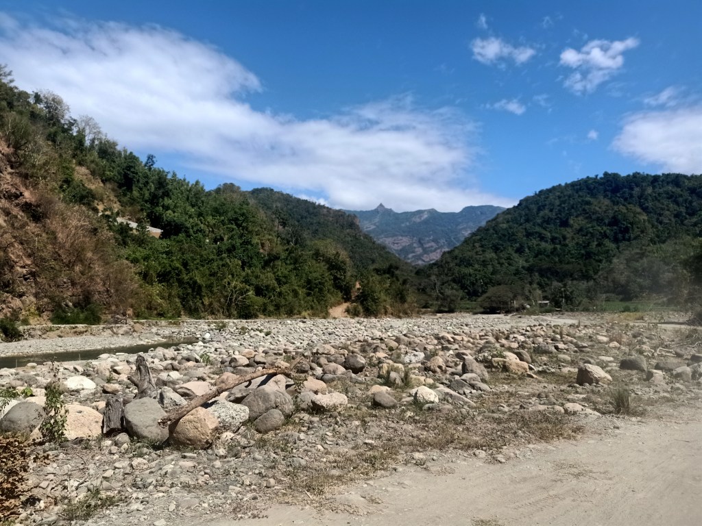We continued the long ride after completing the needed supplies at the market. There, we passed by the side of the first mountain range, where the road leads to a very narrow dirt path where to our right, which was the side I was sitting, a very high drop off a river can be seen. Afterwards, we were at the middle of a valley with no paved roads. We were in the middle of nowhere; it was just us, the mountains at our side, the boulders strewn on our surroundings, and the river which we followed for the entire duration of the ride. It was reminiscent of the 4×4 ride in Mt. Pinatubo. I was wondering if this was the only way going to the town of GDP. If it was, then it really is a rural area.