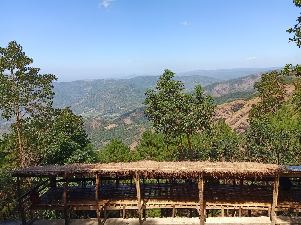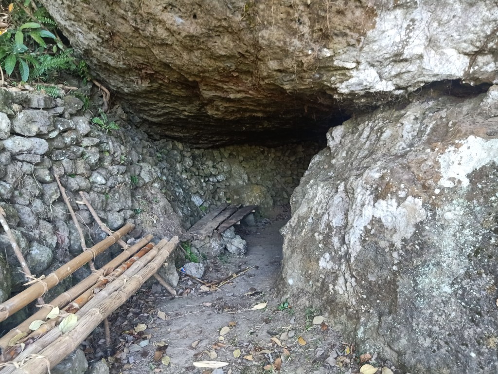 The trail was a constantly ascending wide footpath with a moderate incline inside a forest. This trail would snake the whole area, where we made right and left turns going up. We spotted several kubos as well as boulders encrypted with quotations and reflections about the Battle of Tirad Pass. Most of these writings were in honor of the young general’s heroism. Then, we emerged from the forest towards an exposed ascending trail which leads to a kubo and resting areas by the side of a cliff. There, we saw the mountain range that we passed by going to GDP, as well as the field below it. We rested there for a few minutes and savored the view. Afterwards, we continued our hike. After a few minutes of walking, we passed by a large protruding boulder that creates a very tiny cave below it. This “cave” was complete with benches and resting areas and was said to be where Gregorio Del Pilar rested before ascending Pasong Tirad. We snapped some pictures there and then continued the hike afterwards. Since my body was now getting accustomed to the weight of my backpack, I expedited my pace and told the guide I would go straight to the trail alone. There, I left my companions and went ahead.