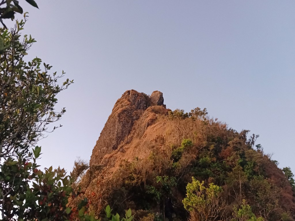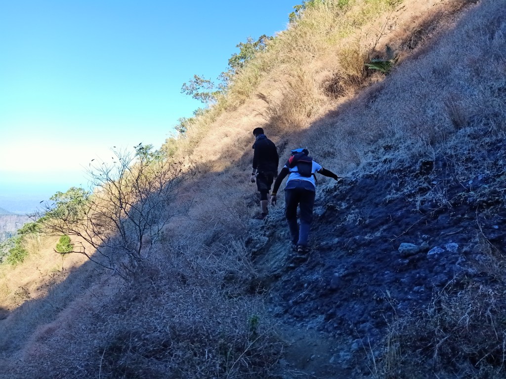 Afterwards, we continued with the ascent. The trail here consists of a constantly ascending trail broken by a few flat portions. We were already panting at this portion as we approached the second hour of the hike. We encountered more roped segments, this time as a descent. Afterwards, I had a glimpse of the peak. It was only a matter of time before reaching its foot. After a few minutes ascending, we made a left turn towards a very steep assault, reminiscent of Mt. Damas. The trail was sharply inclined that our knees were complaining with every step. It was also somewhat slippery. In front of us is a large wall of boulder filled with grass. This makes up the lower reaches of the peak. We negotiated the side of it until we encountered the final roped segment. Daylight was already illuminating the dark place, but since we were in the western portion of the country, we haven’t seen the sun yet at this point. At six in the morning, we reached a narrow ridge at the foot of the monolith. We were now at the summit area.