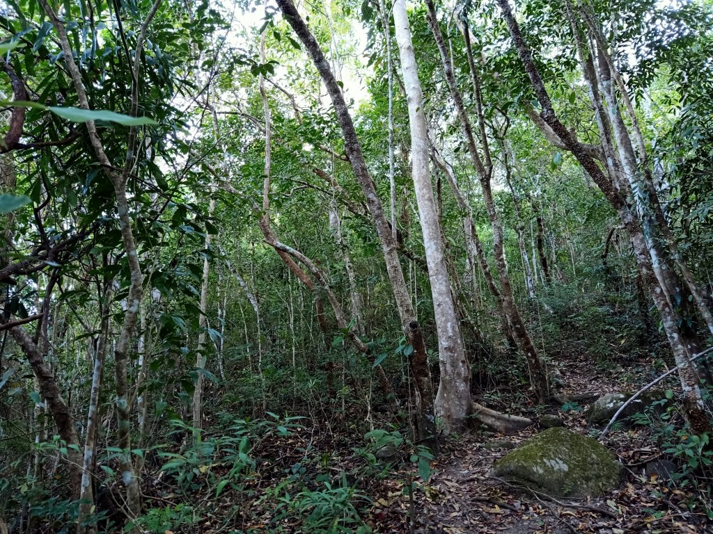 We re-entered the forest once again after the stream. Here, I stepped on loose soil and almost fell at the ravine beside me. Luckily, I was pulled up; I shrugged the feeling off and ignored the wound on my leg and continued the hike. Just a few meters, we encountered the first of the many roped segments of the trail. It was on a steep ascending slope reminiscent of that in Mt. Natib. Afterwards, the rolling trail continues until reaching the halfway point of the hike – a large boulder by the side of the trail complete with rocks where you can sit. We took the time to rest here.