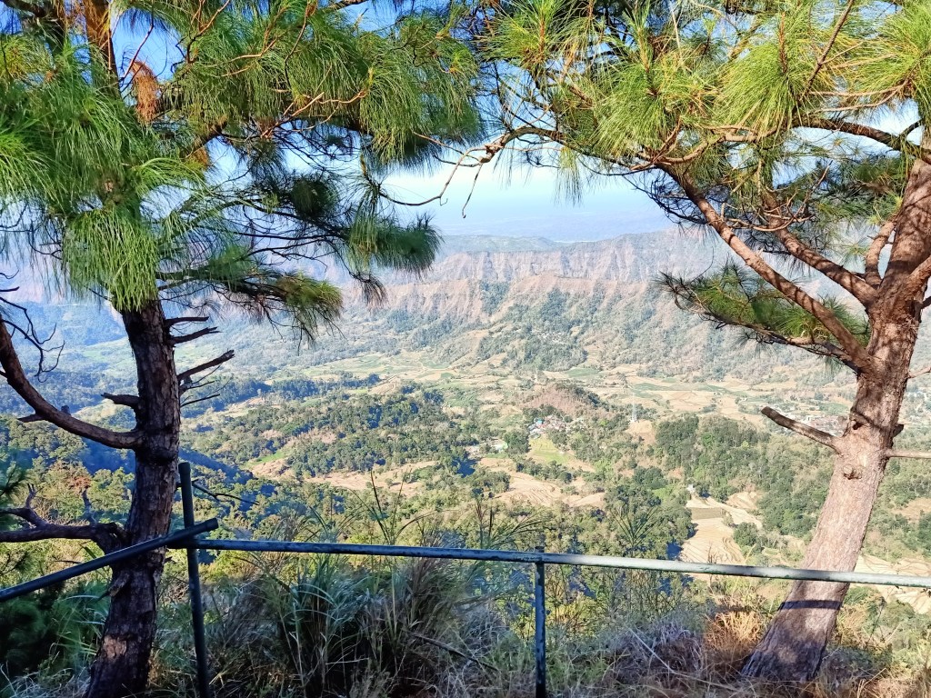 We were continuously walking at the trail, with a few stopovers whenever there was a partition of roped segments or streams. We passed by the foot of the other summit we saw earlier, then we spotted the significant areas we passed by earlier – the large boulder marking the halfway point of the hike, more roped segments, the downward streams, as well as the spot where I almost fell earlier. At around nine in the morning, two hours after starting the descent, we reached the Sniper’s Knoll where we found the lead group resting. There, the three of us took our turn to rest and savored the view. “What a beautiful sight to behold before you die,” I told myself, as this place was where the young general fell from being sniped by an American soldier. This area, unlike most parts of the trail, was filled with pine trees, and its footpath filled with dried pine leaves. We sat down and enjoyed the view.