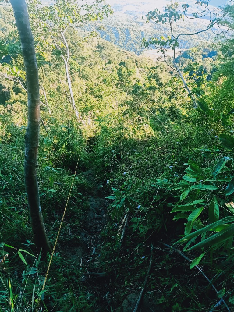 We started the descent past eight in the morning. The first part was on a grassland near the summit area, whereby Mt. Lakay dominates the whole front view. The grass here was thicker and the trail more claustrophobic, as one would need to push through the tall blades of the glass obscuring your way. Afterwards, we entered a forested trail. This is where the descent starts. At first, the descent was steep, but manageable to trail run. But after spending some time on the trail, it gets a lot steeper, with ropes now appearing to assist hikers in this heavy and tiring descent. We spent an hour negotiating that trail.