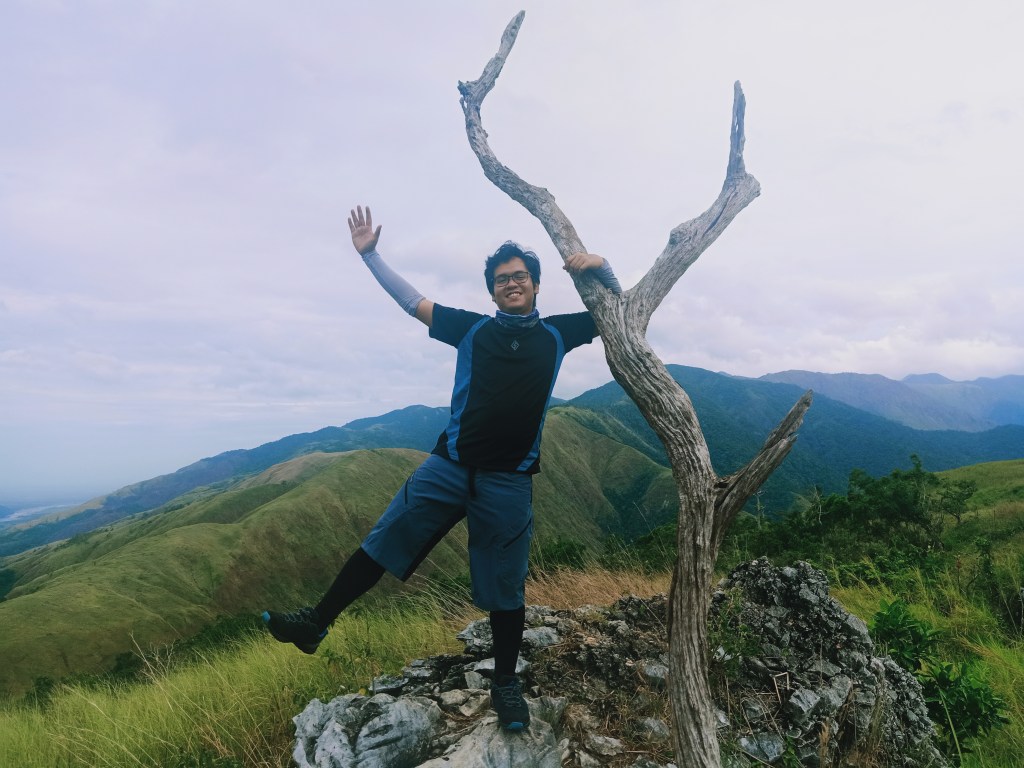 In that grassy trail, Pat and I took the chance to trail run upwards. We would stop for a few meters after covering some distance by running. The trail here, although ascending, was not as sharply inclined as that of the trail at the earlier parts of the hike. After a few minutes, we were able to reach the topmost portion of the grassy mountain we spotted earlier, which forms the plateau-summit of Mt. Sawi. The summit area is located at the end of the plateau where a commanding view of the town of Gabaldon is located. It was marked by a dead tree perched on top of limestone rocks. This dead tree, tales would say, was where a local woman hanged herself because of heartbreak, the folk legend that gave this mountain the name Mt. Sawing Balete.