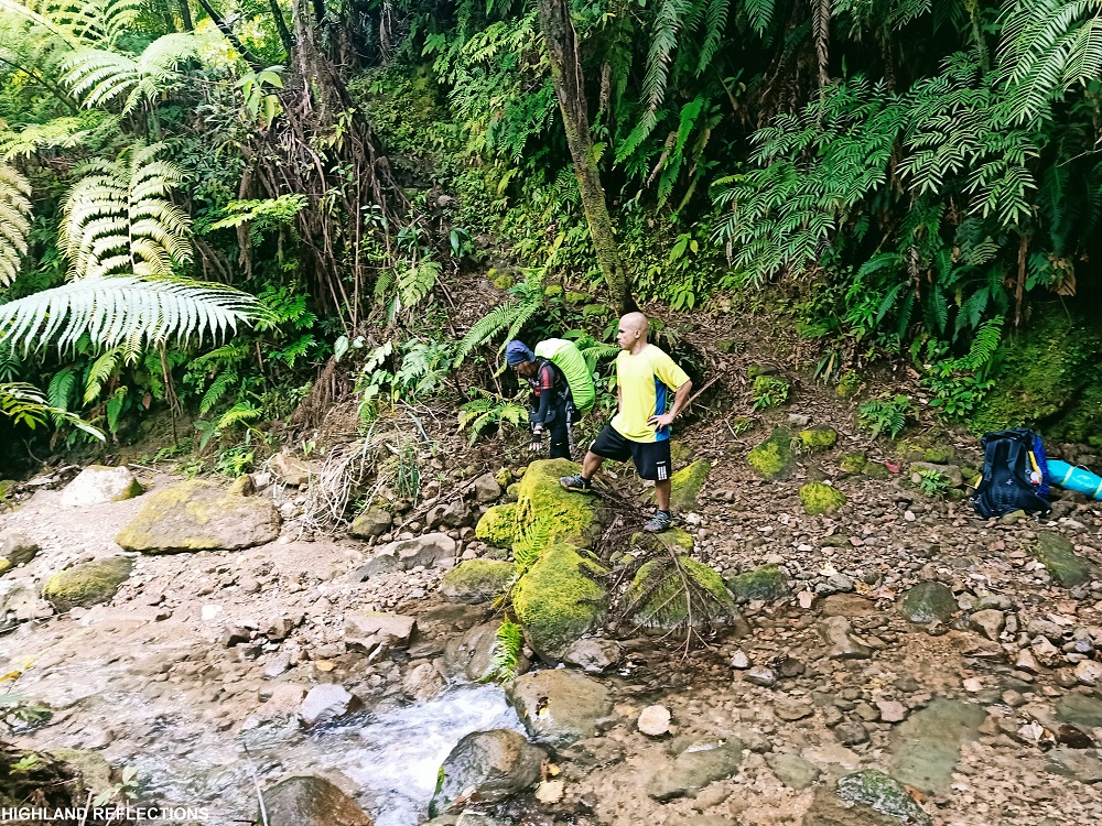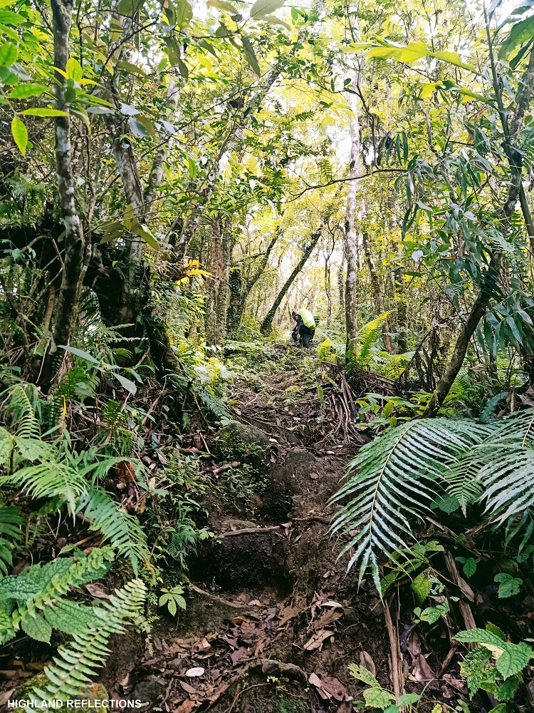 The descent to Dauin started with backtracking some portions of the Apolong Trail for a bit until reaching the junction to Bediao Trail. A kilometer away from Lake Nailig, we encountered Lake Halawig—a dried lake with mossy trees fully grown along its banks. Then, we turned left towards a very steep section in which we needed to use our hands. This short section is the entrance to the Nagbalagbag Ridge, which we traversed for less than an hour before reaching its other side. Once we reached the end of the ridge, a continuous descent on a rainforest followed.