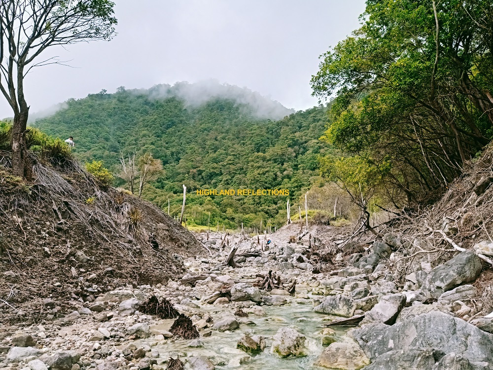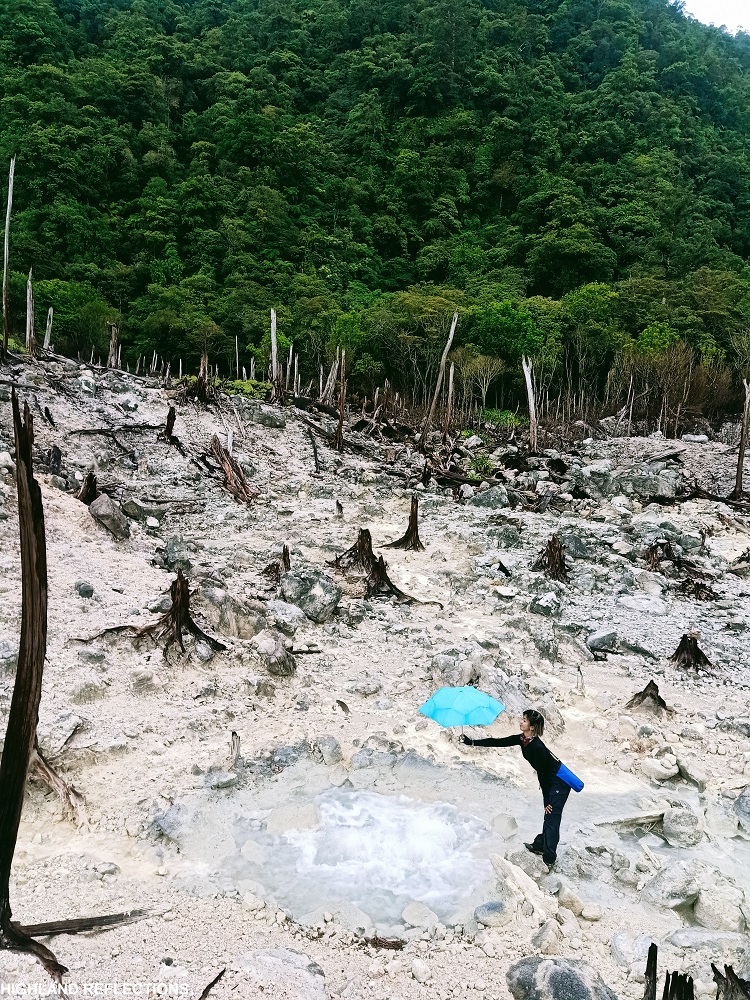 And alas, a deep white gully was revealed in front of us, stretching all the way to the base of Yagumyum Peak a few hundred meters away. This area reeks of desolation, with dead trees being consumed by the sulfuric land, as if it was plagued by an apocalypse. The water flowing in the gully had a dirty yellow shade. We went past the other side of the gully to have a closer view of this bleak vista, revealing a pond with bubbling and boiling water. And as we were contemplating the view, the afternoon rain poured.