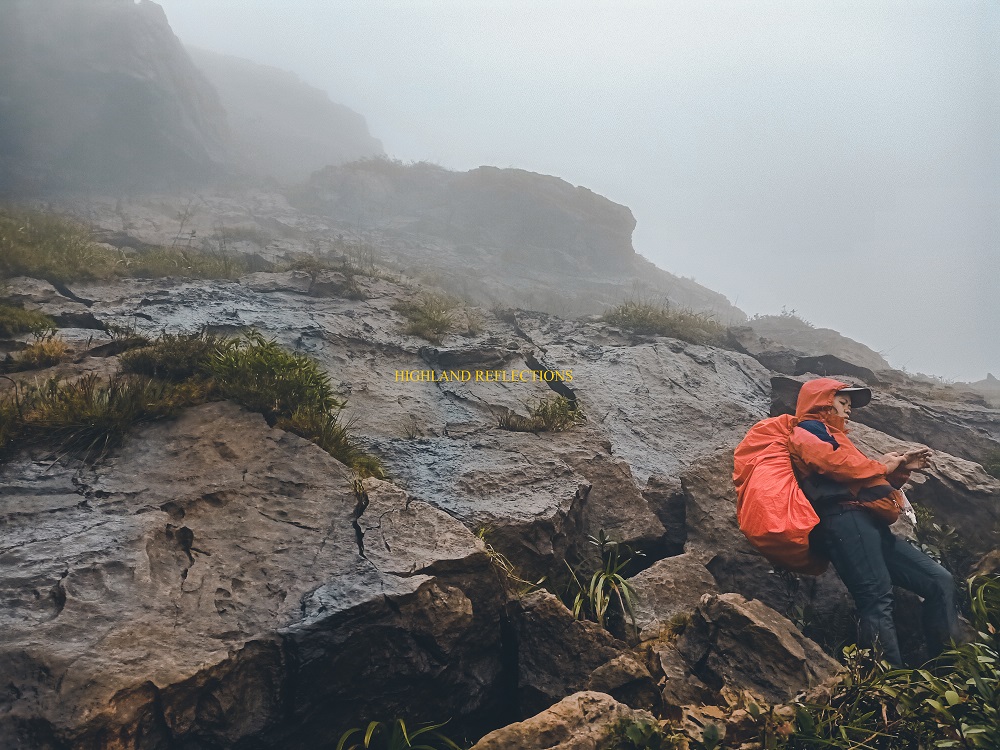The second challenge of the day was encountered four hours after starting from Mayo’s Peak. This was evocatively named as the Kiss the Wall. It’s a narrow pass where we needed to hold on to the wall of boulder in front of us while making our way through footholds carved along the boulders underneath. To our back is a steep drop, that even if the surrounding was blocked in white, we knew how deep the plunge would be if we took a misstep.