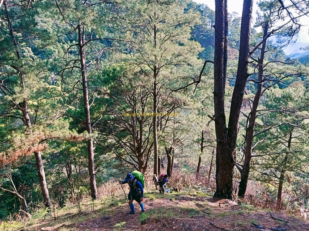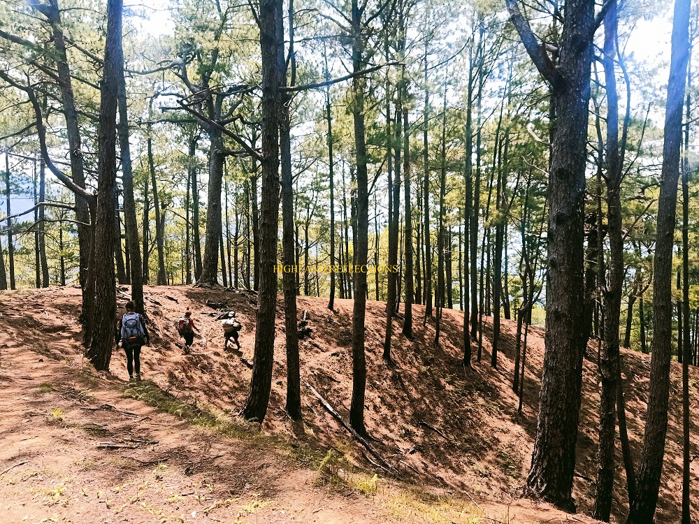 We started the descent at 11:20 in the morning, a bit late than what our itinerary suggested. We backtracked the short section of the pine forest ridge until turning right to a continuous downward slope filled with ashes and burnt pine woods. This section of the trail is called by locals as “Tapgen”, which was another pine forest slope that runs parallel with the trail that we took on the first day, ending at Barangay Pacgued. Although there is now an existing footpath here, the trail was utterly confusing to take on since there were some carved paths that would diverge into two. There were also times when we would detour on nonexistent paths. Fara, Tin, and Rex were kind enough to wait for me and Sir Jose who were lagging a minute behind.