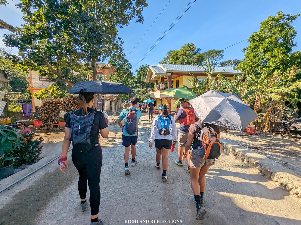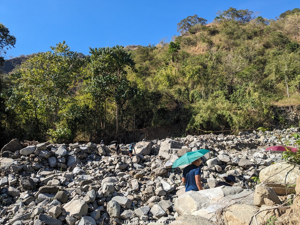 The hike commenced past 9 in the morning. From the barangay proper, we proceeded to the dried riverbed of the expansive Abra River under the scorching heat of the sun. Almost all of us opened our umbrellas as we basked in sunlight! From the river, we could already see the contours of Mt. Bullagao all the way to its summit. From our point of view, it really does resemble Mt. Balingkilat in terms of its geographical shape.