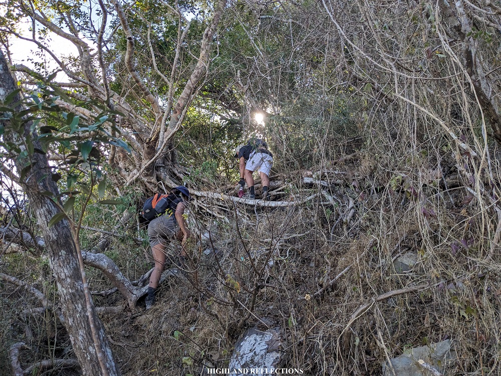 After some minutes of steep ascent, we encountered a protruding dipterocarp tree with its roots morphed with the trail. Past this is a short ascent inside a forest before the summit. At past two in the afternoon, we reached the small summit area of Mt. Bullagao. There wasn’t much to see at the summit as the entire view was surrounded by thick shrubs, except for a limited opening at the northern direction where one could see the continuation of the barren mountain range directly connected to Mt. Bullagao. Present at the summit are some communications equipment.