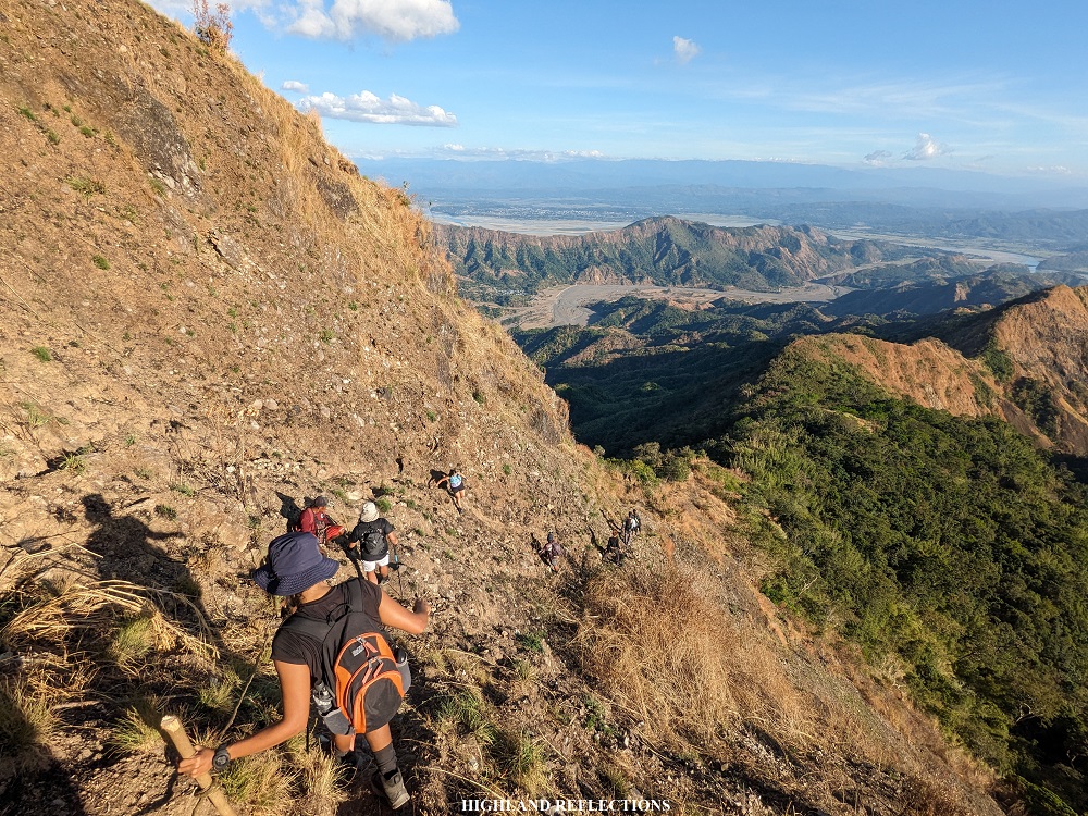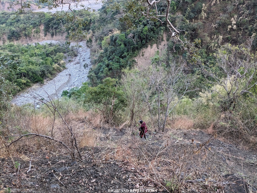 The ascent inside the forest was more gradual compared to the earlier portions. Although more dipterocarp trees were present, there were also bamboo trees surrounding the trail, which I held on to while climbing. The soil remained to be dusty and dry. Along with the sweeper group, we marched ahead gradually, with a few stopovers here and there. After some long minutes of hiking, we exited towards a steep grassy slope reminiscent of the upper portions of Tirad Peak. From here, we could already see Abra River and the barangay way, way down below! We must be nearing the summit.