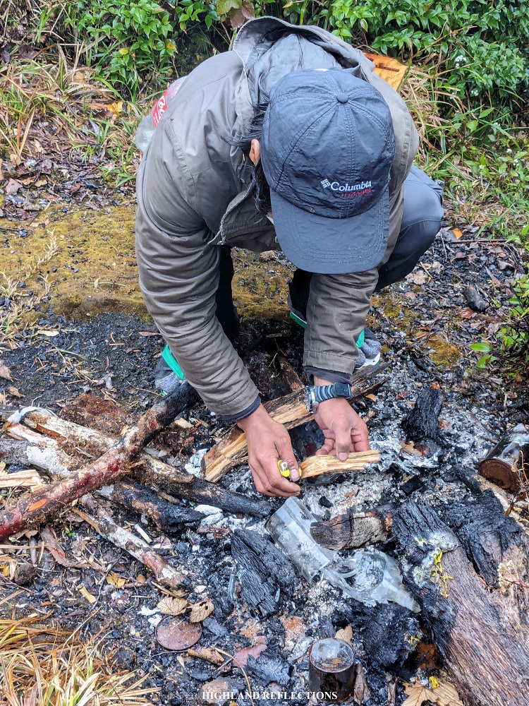 Past Mateo’s Garden was another round of long stretch of mossy forest trail. Here, sunlight caught up to us as we were nearing the summit. After more than thirty minutes past Mateo’s Garden, we arrived at the summit of Mt. Kalawitan. It was seven in the morning. The two guides, one of the joiners, and I were the first to reach it for that day. Thick fog enveloped the entire shrub-covered summit. I snapped some pictures at the dilapidated summit signage and rested at the rear part of the summit where the guides set up a campfire to warm our bodies.