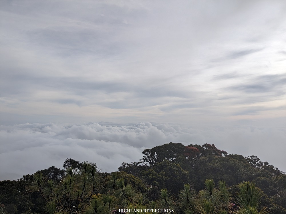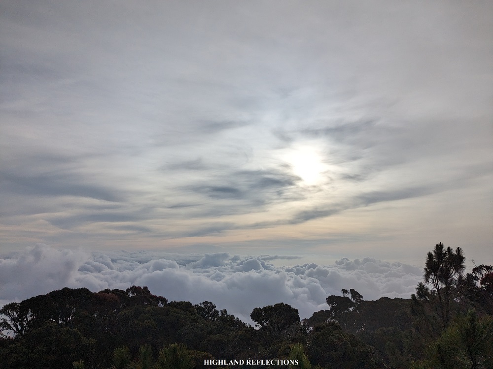 After thirty minutes of chatting with the guides and exploring the area, the skies cleared up for a bit and gave me a limited-time showing of a sea of clouds in front of the summit! The cloudscape was made up of chaotic puffs of cotton-like clouds. The sun was above the clouds, towering over the majestic beauty I was seeing in front of me. I thanked the heavens for blessing me with such a view in my second time on this mountain!
