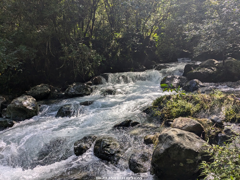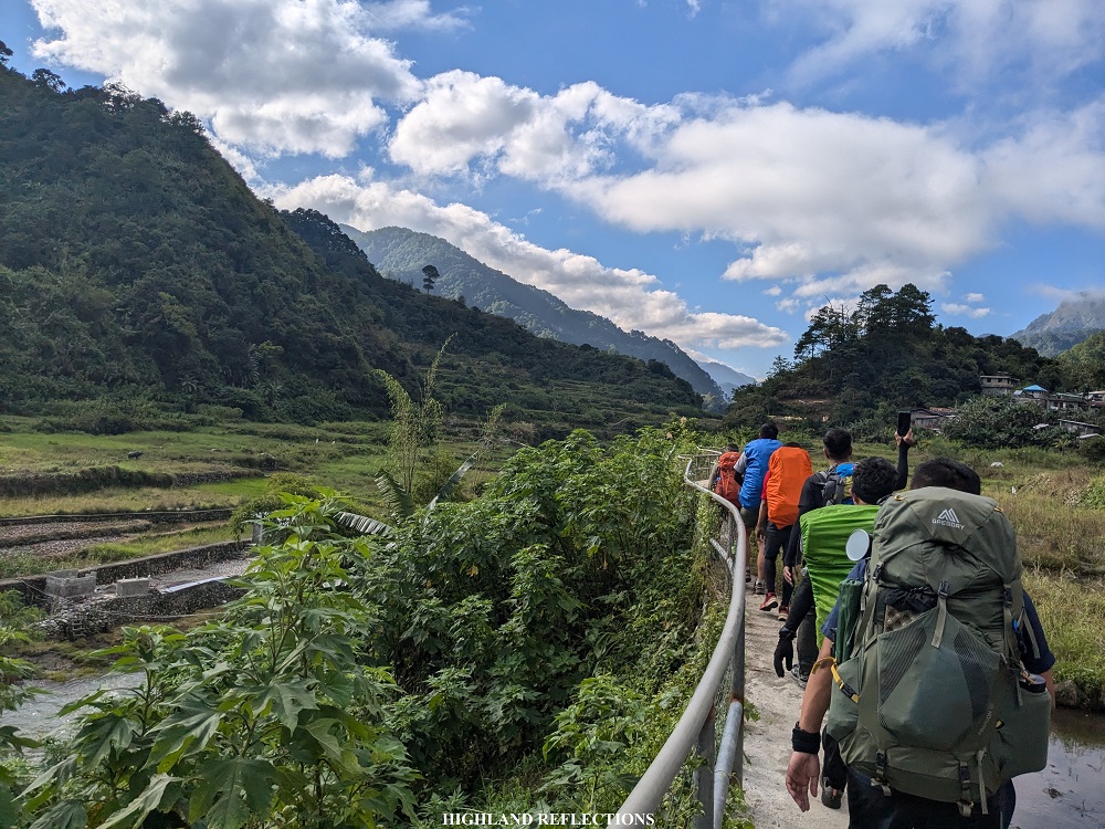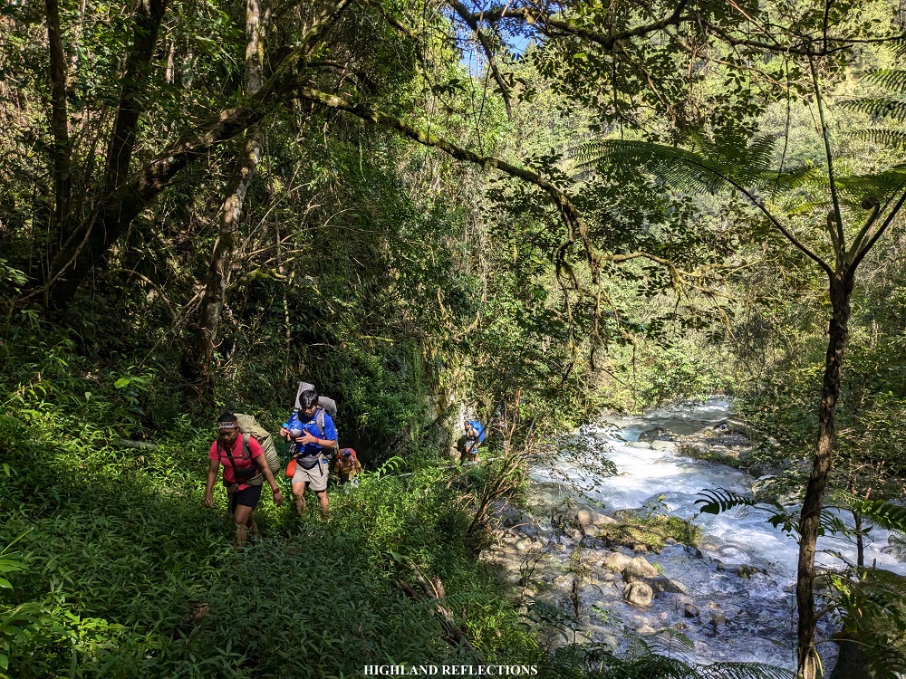 We inched closer to the foot of Mt. Kalawitan past the hanging bridge, entering a valley where to our front is the entire mountain range of Mt. Kalawitan. To our right is a grassy hill attached to Mt. Kalawitan’s slopes, which we will be taking on the descent the next day. The trail here runs on a humid grassland that runs parallel with another river system in the town of Sabangan, the Kapangdanan River, which was much smaller but more intense than Chico River, providing irrigation and water supply to the town of Sabangan. As the river was not advisable to be crossed due to its strong currents, our guides decided to divert and climb up a slope before arriving at a cemented pathway that runs above Kapangdanan River. This cemented path was quite narrow, and one misstep could leave us falling onto the raging river to our left!