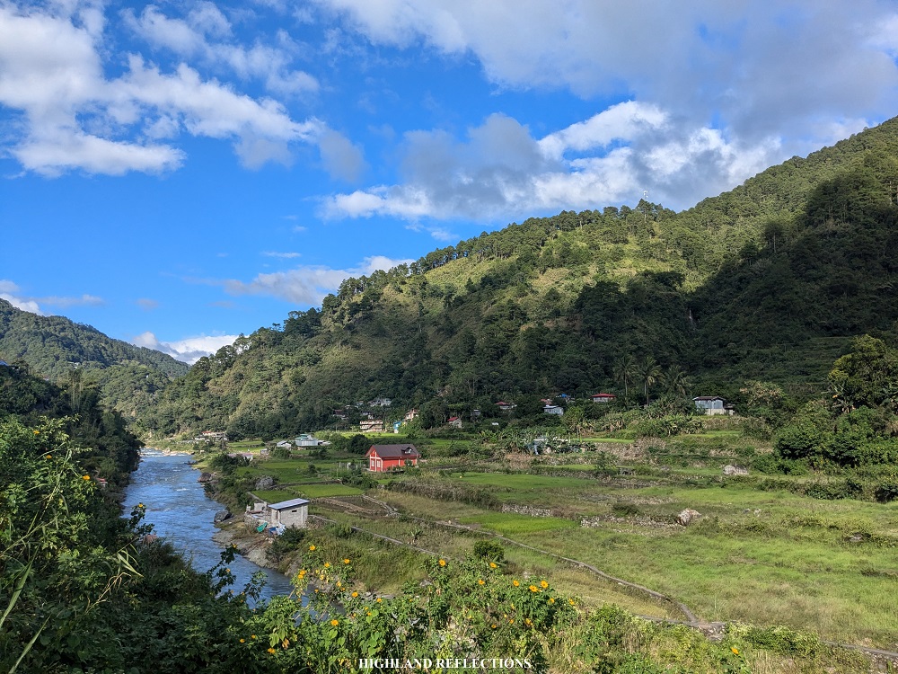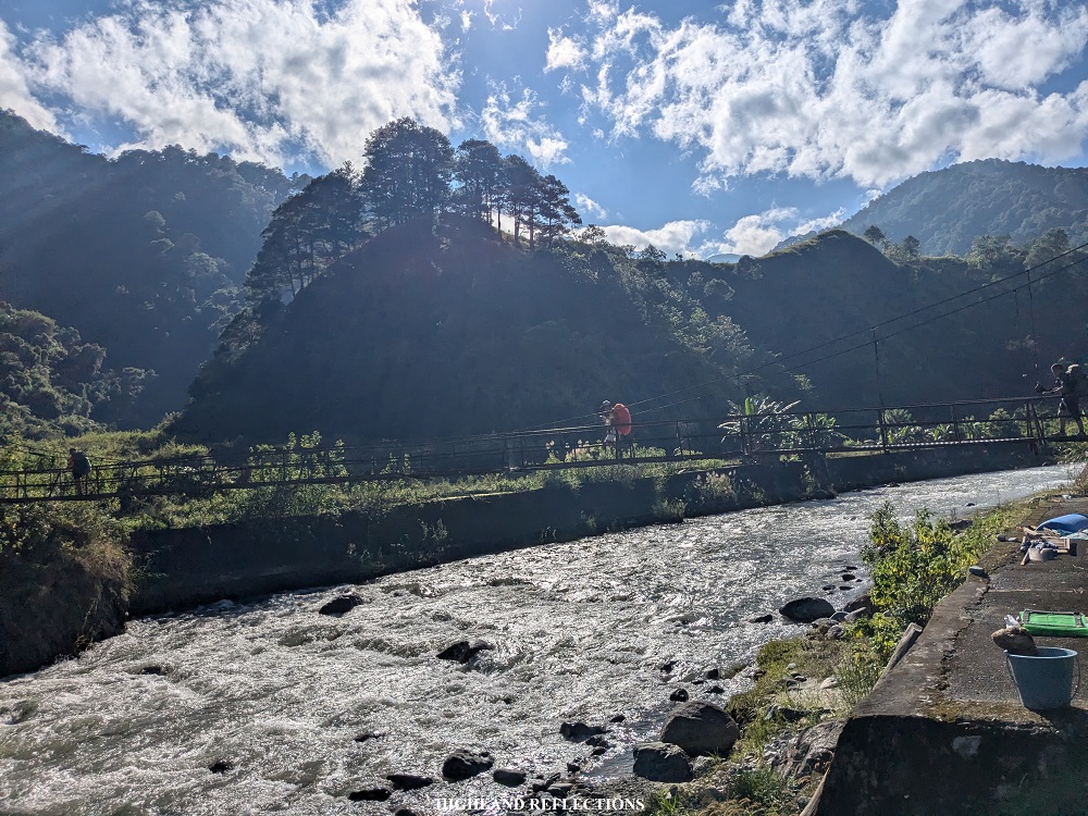 We initially followed the community road before descending to the farmlands of Sabangan. The first part of the trail was on a dike beside Chico River. The sun was up during our hike and we were all exposed to its heat and brightness. Then, we met with our other guides and porters at a junction marked by a welcome tarpaulin marking the start of the trail to Apa Campsite. Past this, we crossed a metal hanging bridge to get to the other side of Chico River (1,040+ MASL).