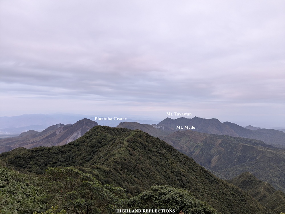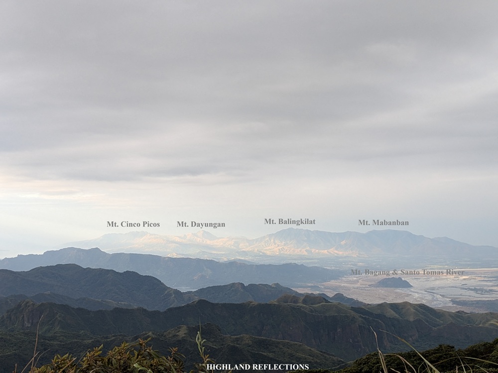 Completing the view is the Cawag Coastal Mountains in the southwestern direction—with the ridges of Mt. Cinco Picos, Mt. Dayungan, Mt. Balingkilat, and Mt. Mabanban traceable from where we were. Just beside Mt. Mabanban, Capones and Camara Islands are visible together with the vast West Philippine Sea. Nearby is Santo Tomas River with its lahar-filled landscape. In the middle of the river is the solitary Mt. Bagang.