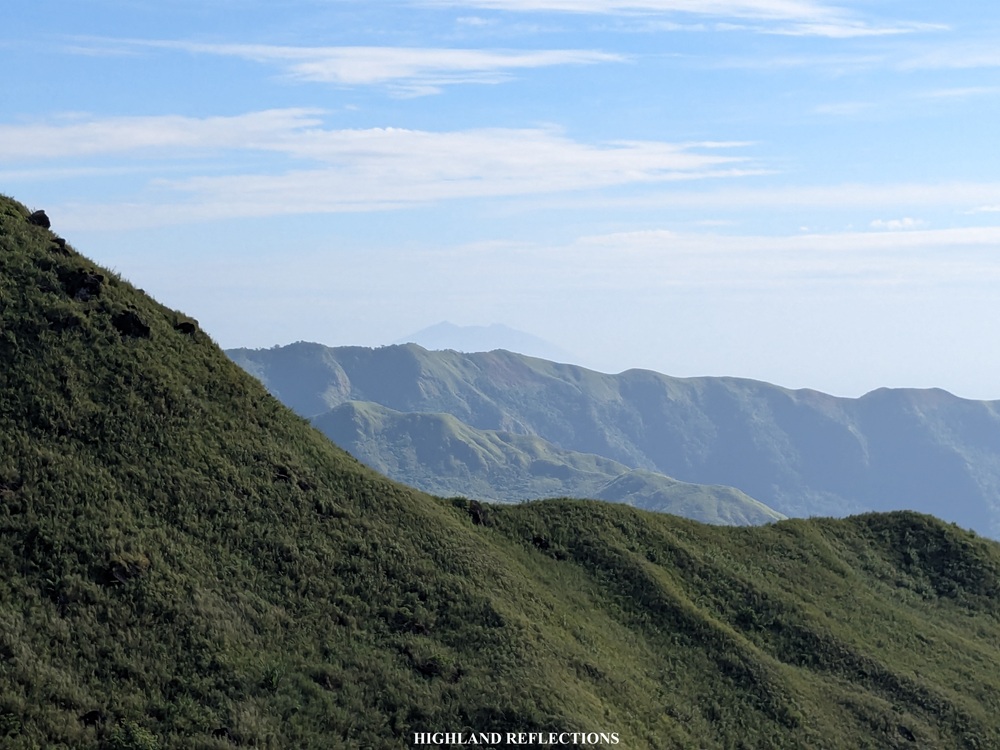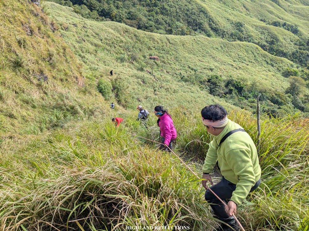 Past the protruded rocks is the continuation of the ascent before making a right turn onwards to Mt. Negron. From this vantage point, I could see the silhouette of the gigantic slopes of the dome-shaped mountain in front of us. It’s as if we were approaching a giant’s head coming from its shoulder! The grassland slope took us to a ridge with steep drops on both sides. The trail here was claustrophobic as the grasses were tall and dense! The only way to get through is to look down and locate the cleared path.