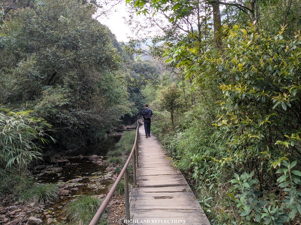 Past this open area, we entered the forest once again. Here, we walked on wooden bridges and platforms that cross the side and on top of a brook.