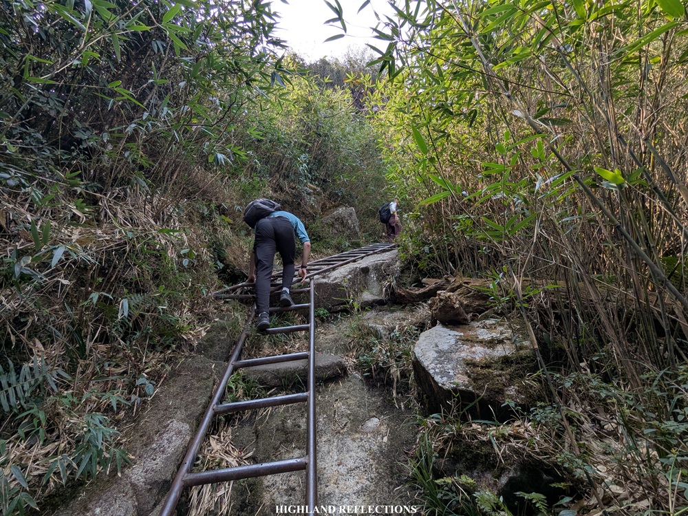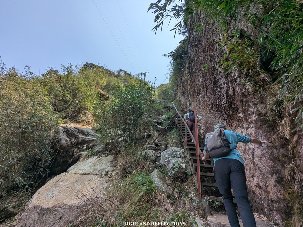 Somewhere in the middle of the trail, we encountered a short, technical steep section that descends towards a dry rivulet. This was followed by two long steel ladders installed on the surface of huge boulders. This was, no doubt, the most difficult portion of the hike. Past the boulder is a continuation of ascent via an installed steel staircase, followed by another long section of a carved stair path inside a bamboo forest. The ascents here were relentless!